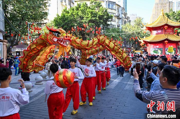 1月25日,廣東廣州,已有百年歷史的西湖花市開市迎客。圖為西湖花市開市巡游活動中的舞龍表演吸引市民。中新社記者 陳驥旻 攝