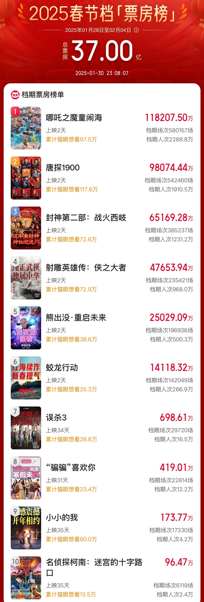 2025春節(jié)檔總票房(含預(yù)售)破37億