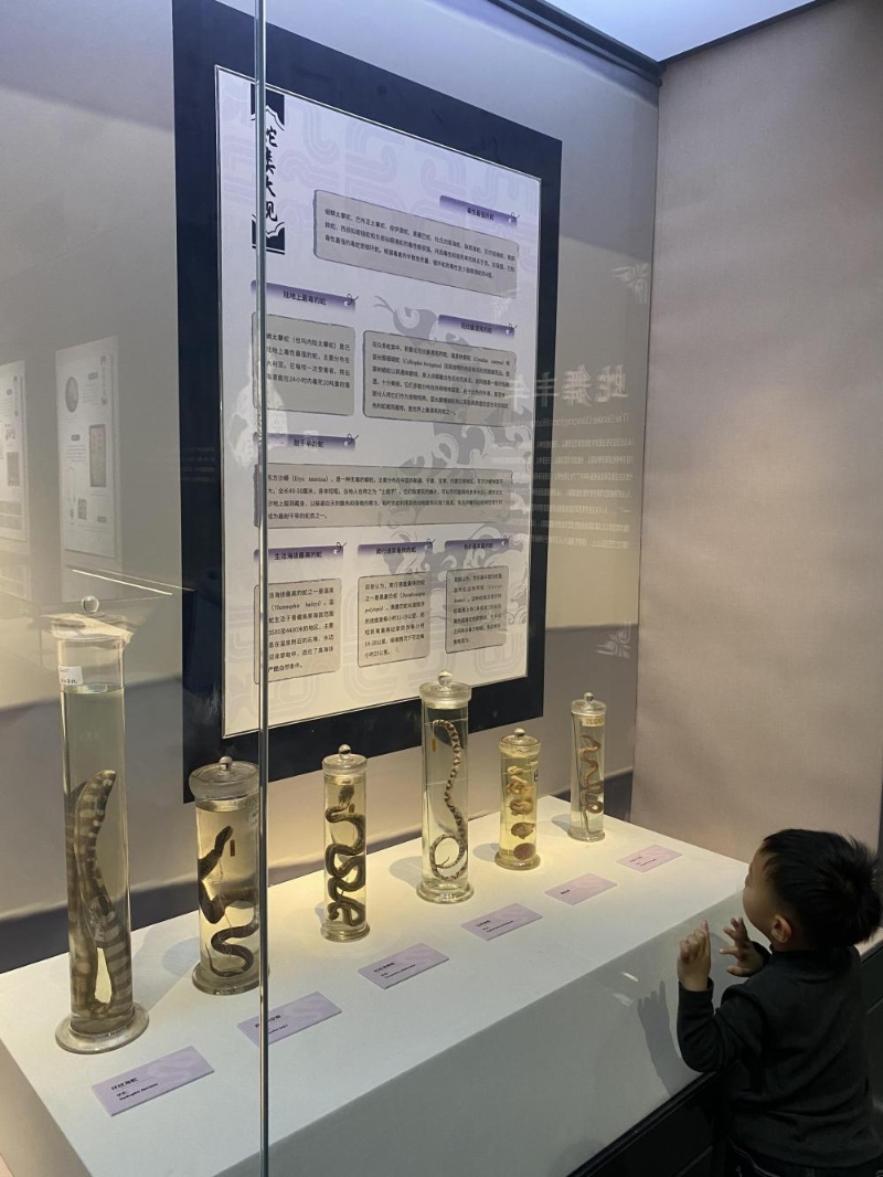 浸泡于玻璃瓶中的蛇、纏繞在“樹干”上的蛇、揚首疾行的蛇,細密的蛇骨骼,盤曲的蛇藥材……近50件精挑細選的珍稀蛇類標本類型豐富、姿態(tài)自然、做工精致,加深著人們對蛇類演化、結(jié)構(gòu)特征、行為習性、種類分布等知識的印象。