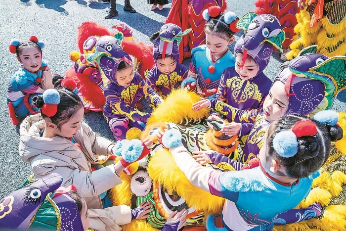 演出間隙,許多參演的小朋友在感受醒獅獅頭的可愛。