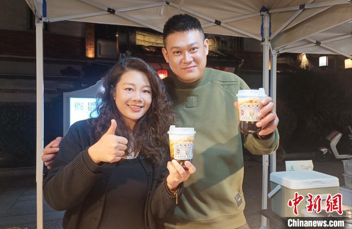 圖為近日,臺青魏志潔和妻子劉靜竟向記者展示在福建漳州古城售賣的飲料臺灣青蛙撞奶。廖珍妹攝