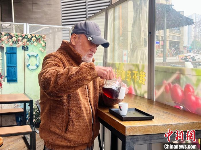 近日,四川成都,來(lái)自臺(tái)灣的潘拯民正為自己倒上一杯剛做好的手沖咖啡。中新社記者 岳依桐 攝