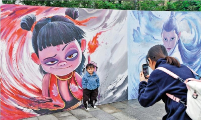 圖:以《哪咤之魔童鬧?!窞橹黝}的涂鴉墻亮相海南省海口市街頭,吸引民眾前來拍照打卡。\中新社