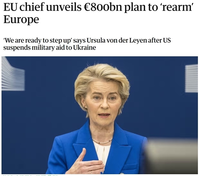 在日前舉行的歐盟特別峰會上,歐洲理事會同意由歐盟委員會主席馮德萊恩提出的“重新武裝歐洲”計劃。