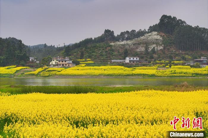 3月12日,四川樂(lè)山,牟子鎮(zhèn)岷江邊競(jìng)相開(kāi)放的油菜花。當(dāng)日,流經(jīng)四川省樂(lè)山市、眉山市的岷江沿岸,競(jìng)相開(kāi)放的油菜花、江水和小洋房交融一起,春色美如畫(huà)。(無(wú)人機(jī)照片)中新社記者 劉忠俊 攝