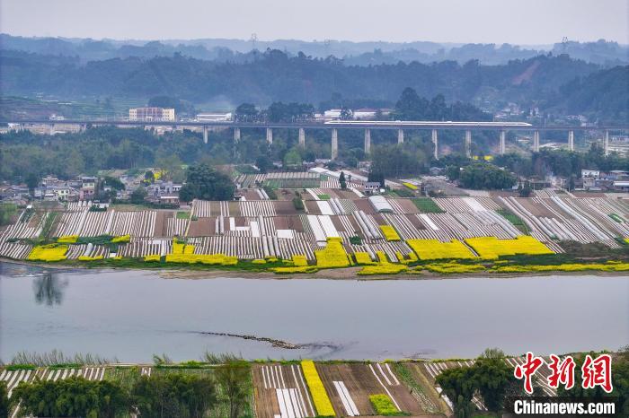 3月12日,四川青神,岷江漢陽(yáng)鎮(zhèn)段江邊油菜花、高鐵等構(gòu)成一幅美麗畫(huà)卷。(無(wú)人機(jī)照片)中新社記者 劉忠俊 攝