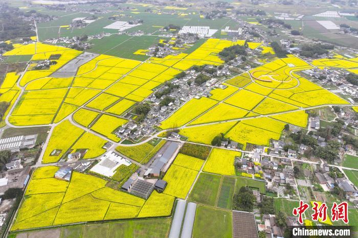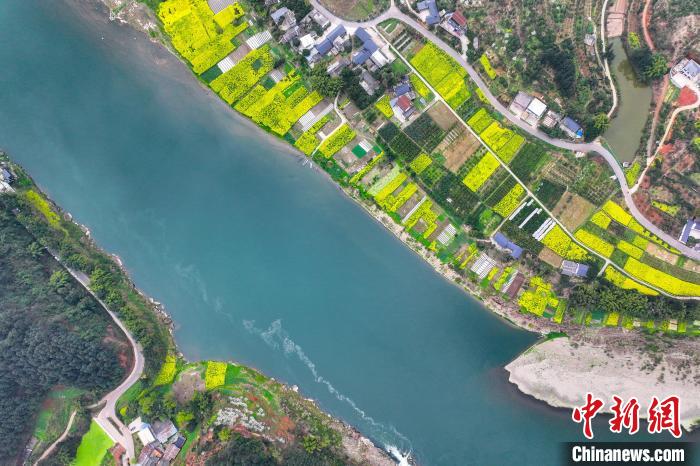 3月12日,四川青神,空中俯瞰岷江邊新光村油菜花田。(無(wú)人機(jī)照片)中新社記者 劉忠俊 攝