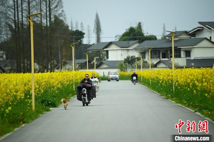 3月12日,四川青神,村民騎車(chē)穿過(guò)油菜花點(diǎn)綴的鄉(xiāng)村公路。中新社記者 劉忠俊 攝