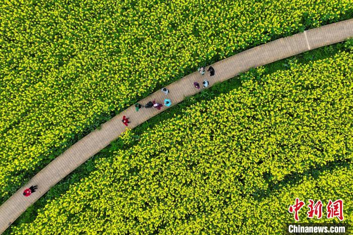 3月12日,四川青神,岷江邊油菜花田里游玩散步的游客。(無(wú)人機(jī)照片)中新社記者 劉忠俊 攝