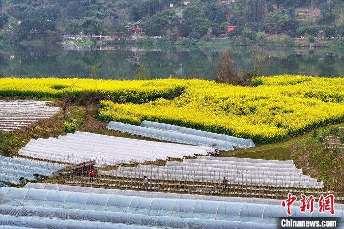 3月12日,四川青神,岷江邊村民正在忙著搭建蔬菜大棚。(無(wú)人機(jī)照片)中新社記者 劉忠俊 攝