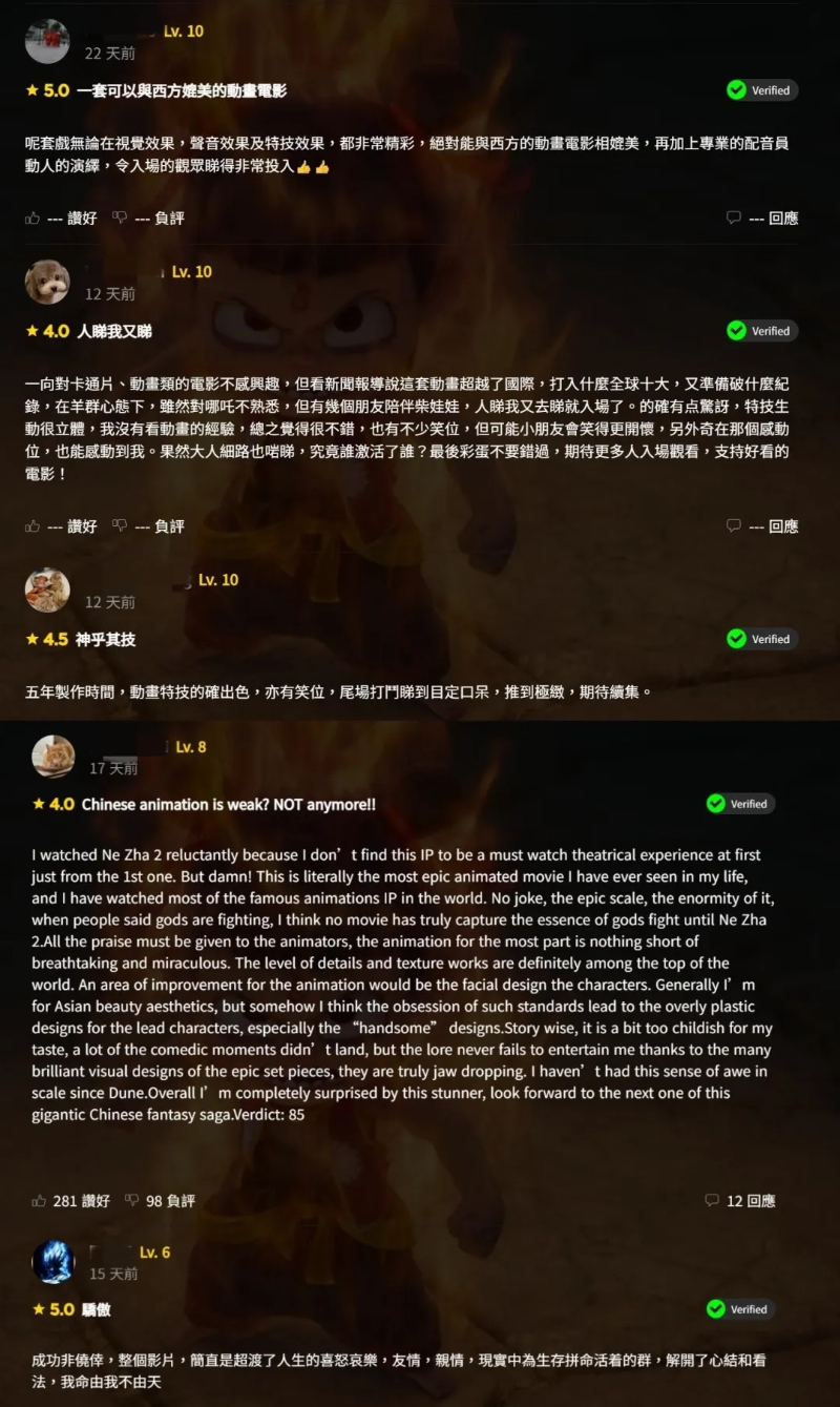 有觀眾留言說:“第二部比上一部格局更大、故事緊湊,有感動也有驚喜,內地動畫可以做到這個地步,十分恭喜!”“這套電影令我對內地電影改觀,絕對是國際級水準,值得買票入場觀看?!币灿性诟弁饧耸繉懙溃骸癈hinese animation is weak? NOT anymore!!”(中國動畫很弱?不再弱了?。?