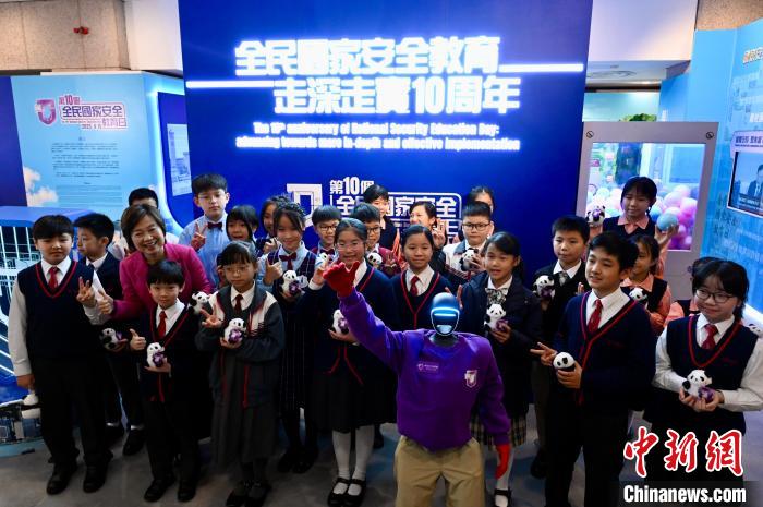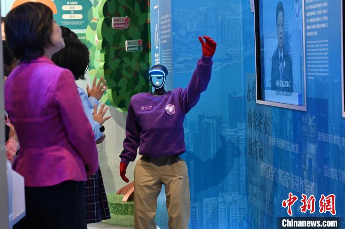 第十個“全民國家安全教育日”將至,3月18日,在香港特區(qū)政府律政司、教育局、保安局、公務(wù)員事務(wù)局和民政及青年事務(wù)局支持下,香港歷史博物館國家安全展覽廳推出“全民國家安全教育日”專題展覽。在展覽開幕活動上,宇樹科技機器人擔(dān)任講解員,向現(xiàn)場嘉賓及學(xué)生們介紹展覽內(nèi)容。圖為宇樹科技機器人(右)介紹專題展覽內(nèi)容。中新網(wǎng)記者 李志華 攝
