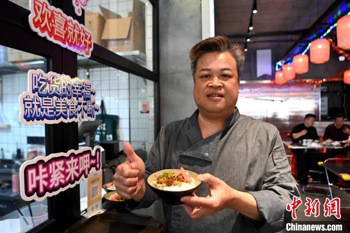 3月18日,臺(tái)胞黃品諺在漳州古城“貴寶地”向記者展示剛制作好的“臺(tái)灣味”鹵肉飯。中新網(wǎng)記者 張金川 攝