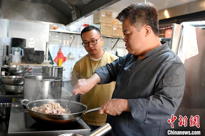3月18日,臺(tái)胞黃品諺(右)在漳州古城“貴寶地”一邊翻炒五花肉,一邊向青年臺(tái)胞蔡鶴立(左)介紹鹵肉飯制作工藝。中新網(wǎng)記者 張金川 攝