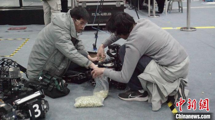 圖為進入比賽場地之前,參賽隊伍在為機器人裝填“彈丸”。莫偉雯 攝