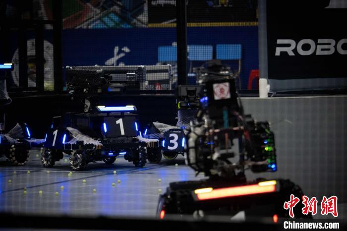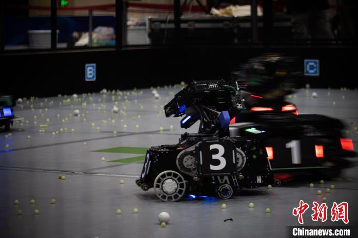 圖為紅藍方隊伍的機器人在散落的“彈丸”中,快速穿梭。桂林信息科技學院 供圖