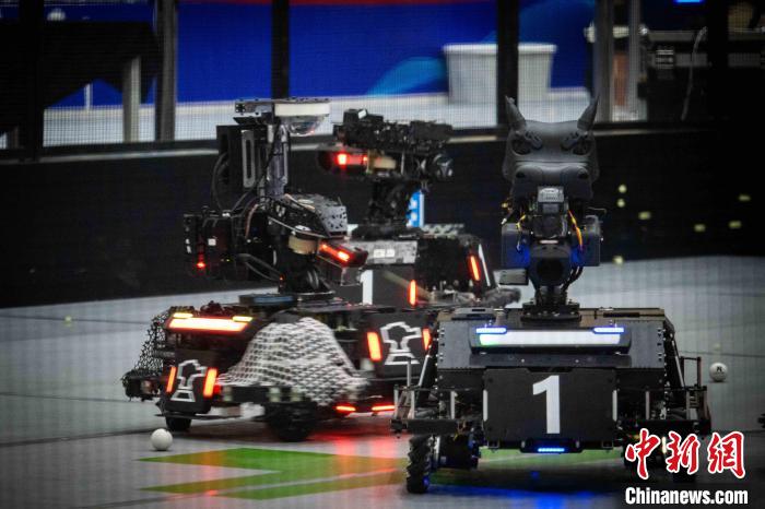 圖為紅方隊伍機器人向藍方隊伍機器人,發(fā)射“彈丸”的瞬間。桂林信息科技學院 供圖