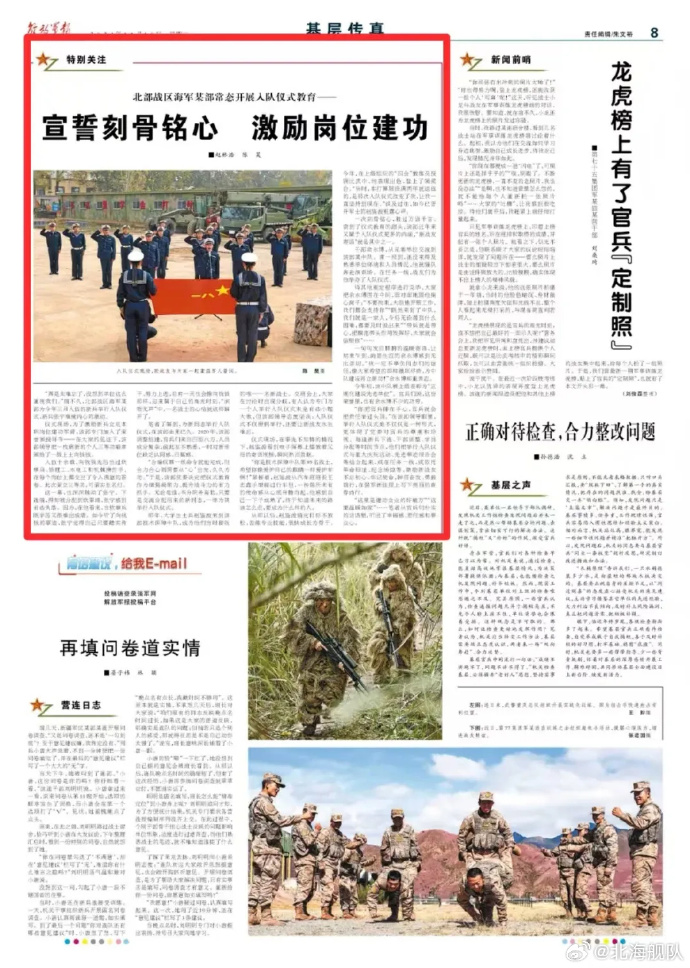 近日,91510部隊(duì)榮譽(yù)墻上的一幅相框突然火了,吸引官兵紛紛前來(lái)打卡,更成為大家熱議的話題。原來(lái),不久前,一篇關(guān)于該部入隊(duì)儀式的新聞通訊刊發(fā)在《解放軍報(bào)》基層傳真版面頭條,這不僅是對(duì)這項(xiàng)儀式教育的認(rèn)可,也是對(duì)該部按綱抓建、助力官兵成長(zhǎng)的褒獎(jiǎng)。(監(jiān)制:孫剛政 王悅 編審:趙陽(yáng) 編輯:婁欣輝 郭景 作者:趙林浩 高淵 孫遜 余永博 陳昊)