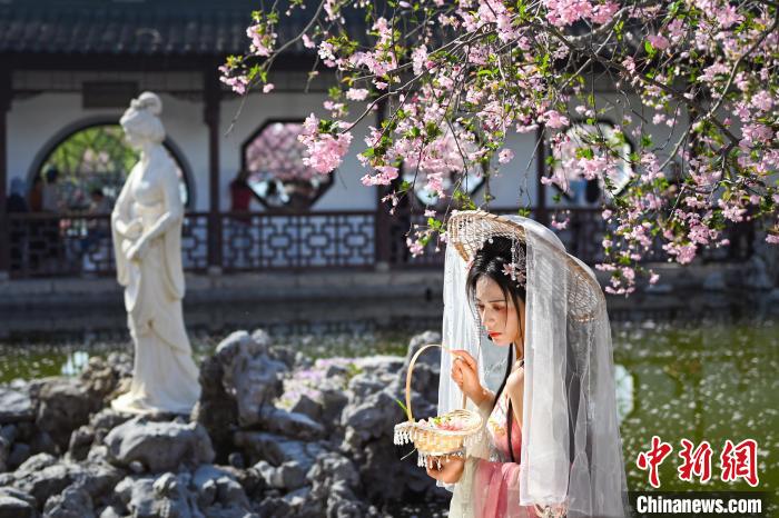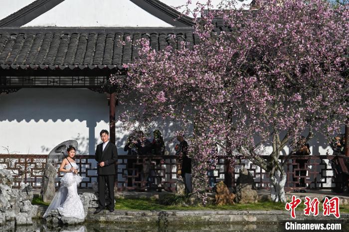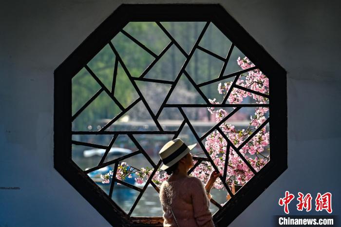 3月25日,江蘇南京,莫愁湖公園里海棠花盛開,與江南園林建筑相映成趣,吸引了眾多市民和游客前來,盡情享受春日美景。中新社記者 泱波 攝