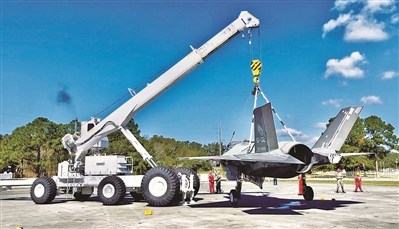 上圖中,一臺造型獨特的救援起重機,輕松吊起一架空重超過14噸的F-35B戰(zhàn)斗機,展現(xiàn)出“大力士”的實力。