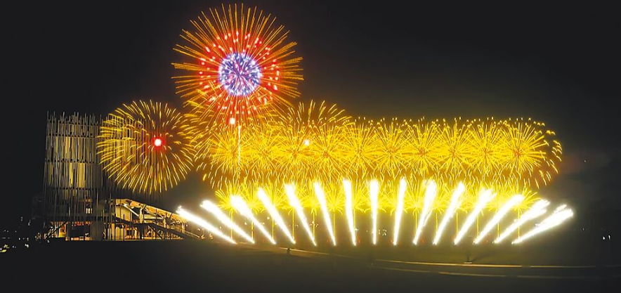 “融合”章節(jié)通過多種造型煙火同步綻放,象征新北成為文化交會(huì)場域;最終章“展望”以多層次金銀色瀑布煙火由高空傾瀉而下,象征著藝術(shù)的未來不斷推進(jìn),宣告新北市的嶄新美學(xué)時(shí)代正式啟動(dòng)。