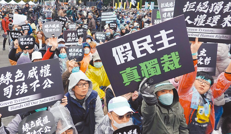 圖為臺灣民眾黨舉行“111拒絕綠色威權,還我司法正義”活動,民眾高舉標語抗議綠色威權。(臺灣《中國時報》資料照片)