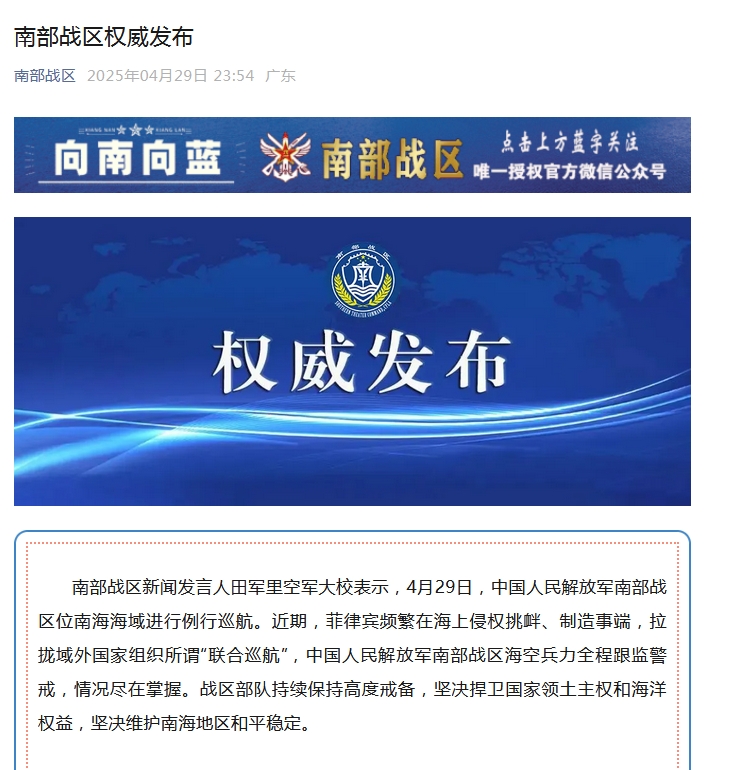 中新網(wǎng)4月30日電 據(jù)南部戰(zhàn)區(qū)微信公眾號(hào)消息,南部戰(zhàn)區(qū)新聞發(fā)言人田軍里空軍大校表示,4月29日,中國人民解放軍南部戰(zhàn)區(qū)位南海海域進(jìn)行例行巡航。近期,菲律賓頻繁在海上侵權(quán)挑釁、制造事端,拉攏域外國家組織所謂“聯(lián)合巡航”,中國人民解放軍南部戰(zhàn)區(qū)??毡θ谈O(jiān)警戒,情況盡在掌握。戰(zhàn)區(qū)部隊(duì)持續(xù)保持高度戒備,堅(jiān)決捍衛(wèi)國家領(lǐng)土主權(quán)和海洋權(quán)益,堅(jiān)決維護(hù)南海地區(qū)和平穩(wěn)定。
