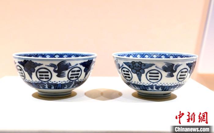 圖為展覽展出的四川博物院收藏的清光緒青花八卦云鶴紋瓷碗。中新社記者 安源 攝