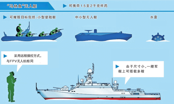 據(jù)俄羅斯媒體報(bào)道,俄羅斯一所海軍學(xué)院研制出一款微型無(wú)人艇,代號(hào)“馬林魚”。這種微型無(wú)人艇采用“以小博大”的戰(zhàn)術(shù),能夠有效應(yīng)對(duì)敵方輕型船艇、自殺式無(wú)人艇的攻擊,成為近年來(lái)艦艇防御作戰(zhàn)的新興力量之一。