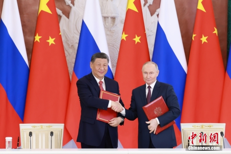 當?shù)貢r間5月8日上午,俄羅斯總統(tǒng)普京同中國國家主席習近平在莫斯科克里姆林宮舉行會談。會談后,兩國元首共同簽署《中華人民共和國和俄羅斯聯(lián)邦在紀念中國人民抗日戰(zhàn)爭、蘇聯(lián)偉大衛(wèi)國戰(zhàn)爭勝利和聯(lián)合國成立80周年之際關(guān)于進一步深化中俄新時代全面戰(zhàn)略協(xié)作伙伴關(guān)系的聯(lián)合聲明》。中新社記者 盛佳鵬 攝