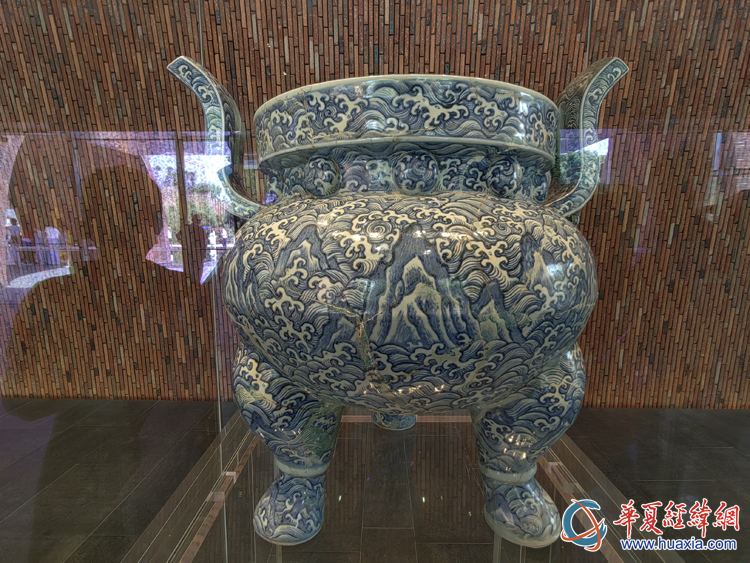 景德鎮(zhèn)御窯博物館展示的明代青花江崖海水紋雙耳三足爐。(攝影:虞鷹)