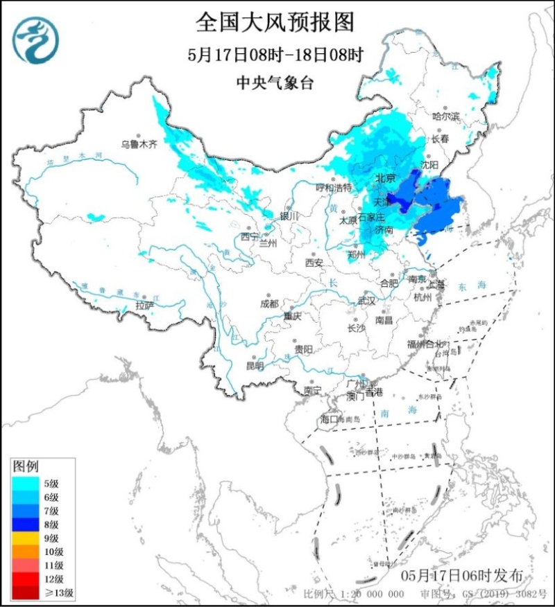 受氣旋和冷空氣影響,17日,西北地區(qū)東部、內(nèi)蒙古大部、華北地區(qū)、東北地區(qū)、黃淮北部等地有大風(fēng)天氣過程。中央氣象臺5月17日06時繼續(xù)發(fā)布大風(fēng)藍(lán)色預(yù)警。預(yù)計,5月17日08時至18日08時,內(nèi)蒙古中東部、河北大部、北京、天津、遼寧中西部、山東、河南北部、安徽北部、甘肅河西、新疆東部等地有5~6級風(fēng)、陣風(fēng)7~8級,其中,河北北部、遼寧西部、天津東部等地局地有7~8級風(fēng)、陣風(fēng)9~10級;渤海、渤海海峽、黃海北部和中部海域?qū)⒂?~8級風(fēng)、陣風(fēng)9~10級。