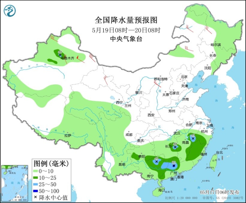 5月19日08時至20日08時,新疆沿天山地區(qū)、江南中東部、西南地區(qū)東南部、華南北部等地部分地區(qū)有中到大雨,其中,廣東西北部等地部分地區(qū)有暴雨(50~60毫米)。內(nèi)蒙古河套地區(qū)和東部、黑龍江西南部、新疆北部、甘肅河西等地部分地區(qū)有4~6級風(fēng),其中,新疆東部山口地區(qū)有7~8級風(fēng)。