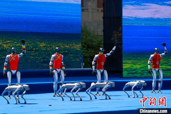 圖為人形機器人和機器狗在舞臺表演。中新社記者 薛蒂 攝