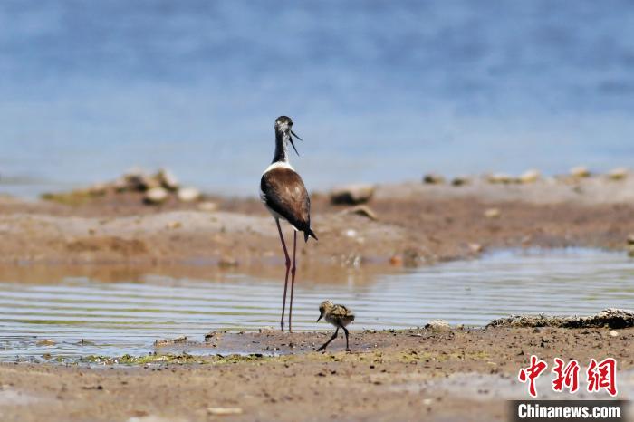 6月3日,一只黑翅長(zhǎng)腳鷸鳥(niǎo)媽媽在水邊“遛娃”。王海濱 攝