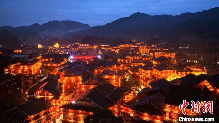 近日,無人機(jī)鏡頭下的廣西三江侗族自治縣林溪鎮(zhèn)程陽八寨景區(qū)流光溢彩、美若仙境。夜幕下,燈光與建筑共鳴,織就一幅“古寨披輝、橋影漾金、山水和鳴”的美麗畫卷。圖為夜幕下的程陽八寨。龔普康 攝