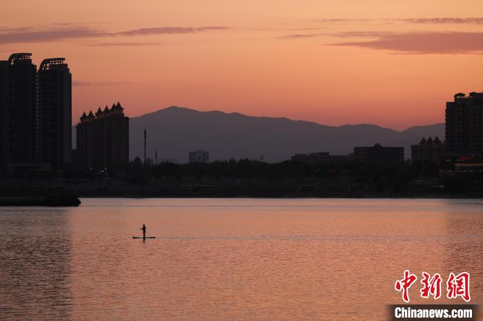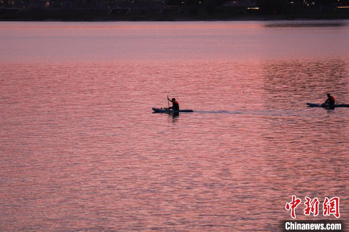 6月16日傍晚,江西南昌上空落日美景,晚霞滿天,市民滑漿板于贛江上欣賞美麗晚霞。中新社記者 劉思偉 攝