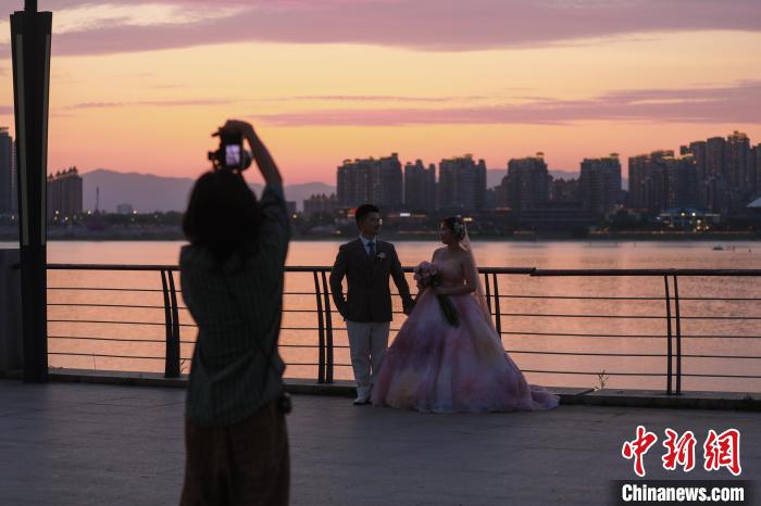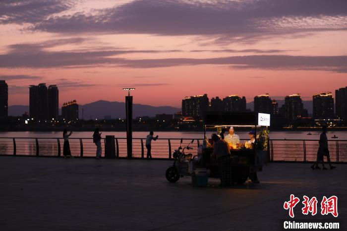 6月16日傍晚,江西南昌上空落日美景,晚霞滿天,不少民眾來到朝陽江灘公園欣賞晚霞美景。中新社記者 劉思偉 攝