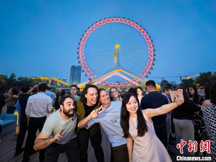 6月26日晚,達(dá)沃斯嘉賓與“天津之眼”摩天輪合影。中新社記者 佟郁 攝