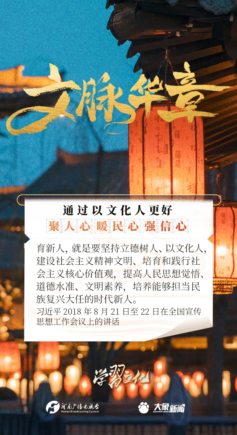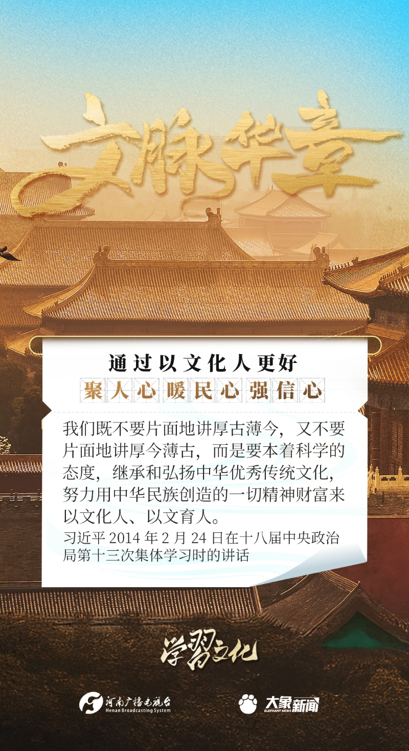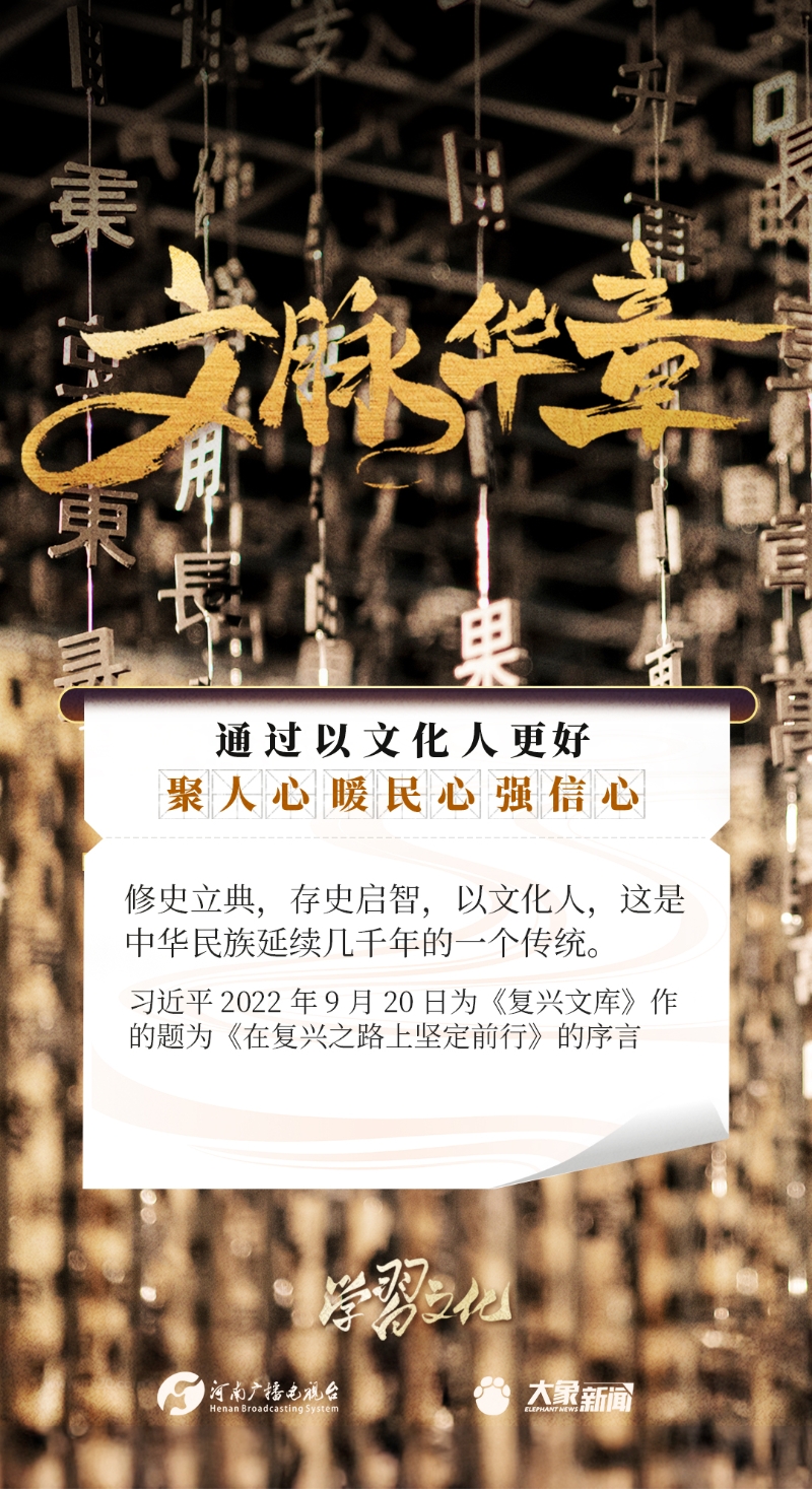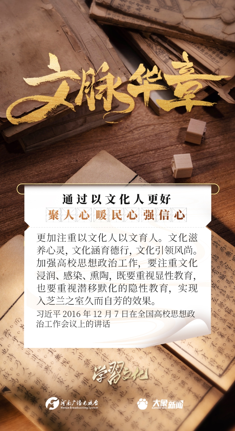 以文化人,是中華民族延續(xù)幾千年的一個傳統(tǒng),也是增強(qiáng)民族凝聚力、民族自豪感的重要依托。習(xí)近平總書記一貫倡導(dǎo)以文化人,激發(fā)廣大干部群眾改革創(chuàng)新、振興發(fā)展的激情和斗志,發(fā)表了一系列重要講話,大象新聞邀您一起學(xué)思踐悟。