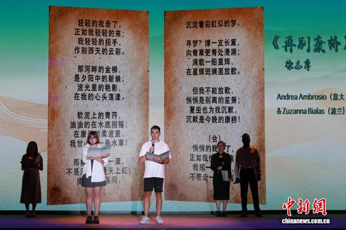 7月19日,海外留學生朗誦中國詩歌《再別康橋》。當晚,“秀山麗水·飛越夢想”國際詩會在浙江麗水舉行,來自海內(nèi)外的留學生、華僑代表及文藝工作者相聚一堂,以中外經(jīng)典詩篇朗誦為核心,融入歌舞演繹、民族服飾走秀、器樂合奏和非遺技藝展示等多元形式,誦經(jīng)典、展風采、傳文化。孫楊洋 攝