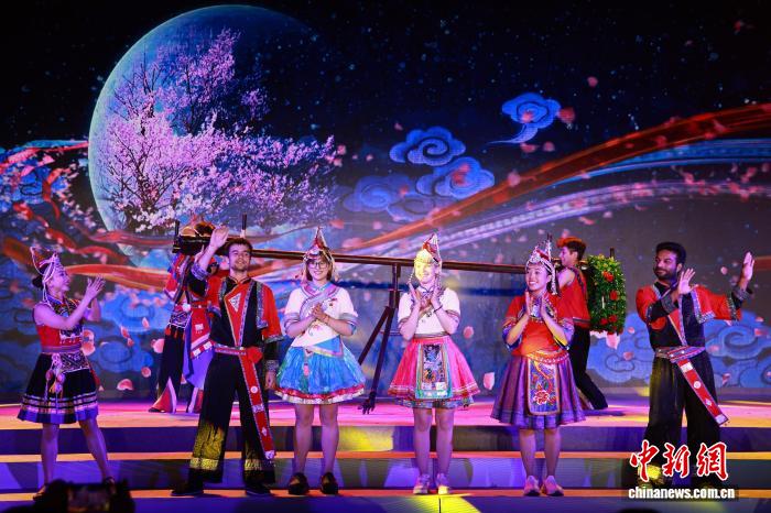 7月19日,中外青年在畬族歌舞節(jié)目中互動。當晚,“秀山麗水·飛越夢想”國際詩會在浙江麗水舉行,來自海內(nèi)外的留學生、華僑代表及文藝工作者相聚一堂,以中外經(jīng)典詩篇朗誦為核心,融入歌舞演繹、民族服飾走秀、器樂合奏和非遺技藝展示等多元形式,誦經(jīng)典、展風采、傳文化。孫楊洋 攝