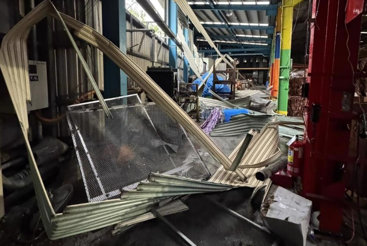 新營產(chǎn)業(yè)園區(qū)內(nèi)的部分廠房受風(fēng)災(zāi)毀損,內(nèi)部一片狼藉。(讀者提供/程炳璋臺南傳真)