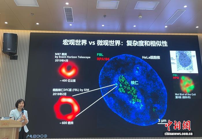 中國科學(xué)院分子細(xì)胞科學(xué)卓越創(chuàng)新中心研究員陳玲玲24日在上海接受采訪時(shí)展示了一組照片,一張是事件視界望遠(yuǎn)鏡(EHT)于2019年4月發(fā)布的人類首張黑洞照片——M87黑洞,該黑洞事件視界直徑為400億公里;另一張是2018年2月,陳玲玲團(tuán)隊(duì)拍攝到的細(xì)胞核仁DFC(致密纖維組分)層圖像,其直徑為600納米。