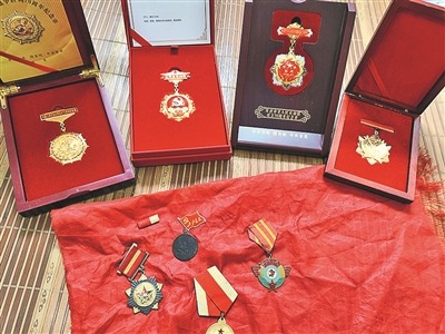包在紅袋子里的部分紀念章。馮 嵐攝