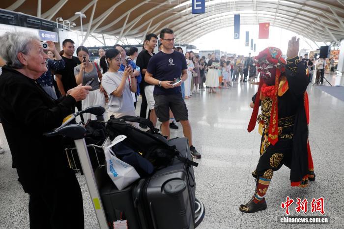 7月28日,演員在航站樓出發(fā)公共區(qū)域表演,并與游客互動。中新社記者 殷立勤 攝