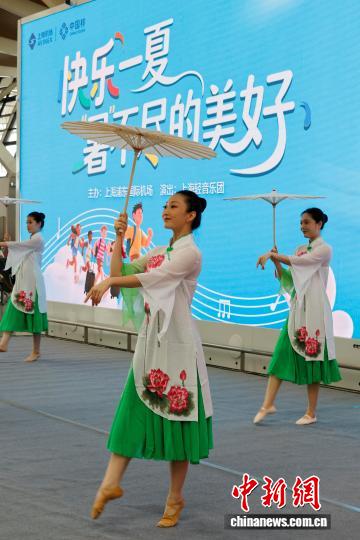 7月28日,演員在航站樓出發(fā)公共區(qū)域表演。當日,上海機場“快樂一夏,‘暑’不盡的美好”暑運周周演活動在浦東國際機場舉行,為旅客提供了更具人文氣質和服務品質的出行體驗。中新社記者 殷立勤 攝