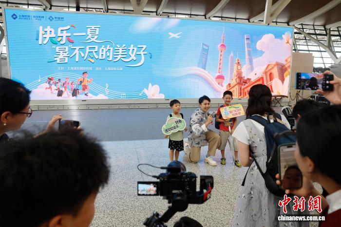 7月28日,演員在航站樓出發(fā)公共區(qū)域表演,并與游客互動合影。中新社記者 殷立勤 攝
