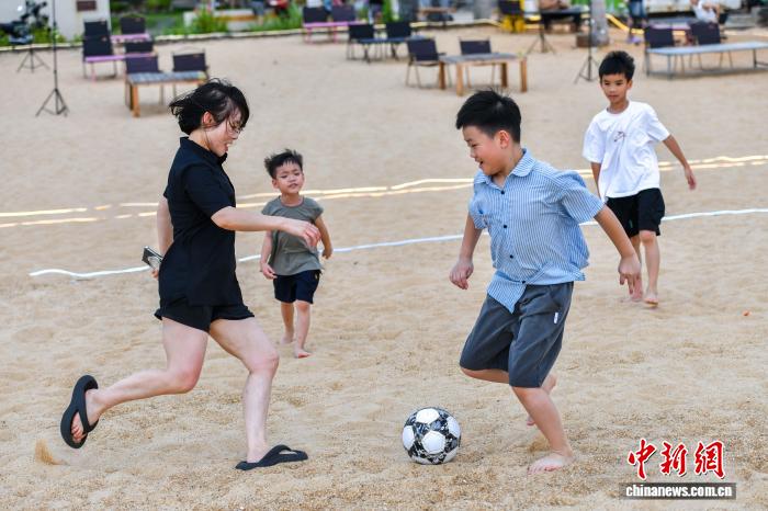 7月29日,海南海口,民眾在榮山寮村沙灘踢足球。中新社記者 駱云飛 攝