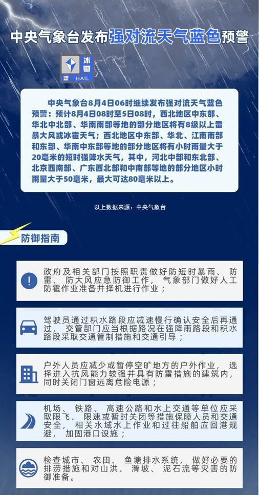 8月4日6時,中央氣象臺發(fā)布暴雨橙色、高溫橙色、強對流藍色三預(yù)警: